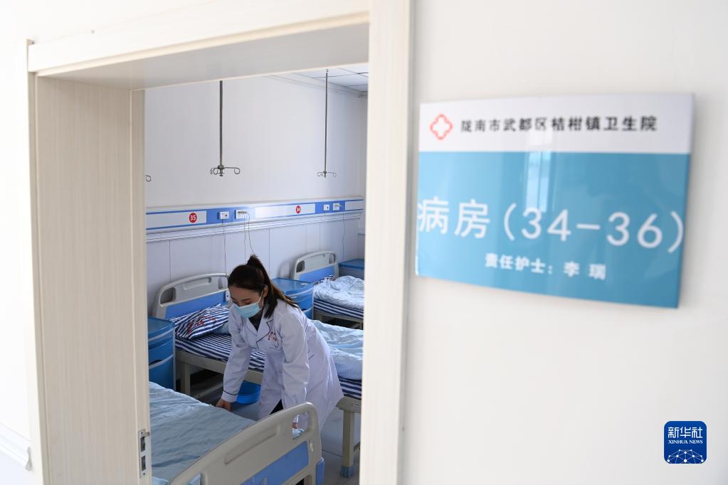 在武都区桔柑镇卫生院住院部病房,李瑞在整理患者床铺(5月11日摄)。新华社记者 范培珅 摄