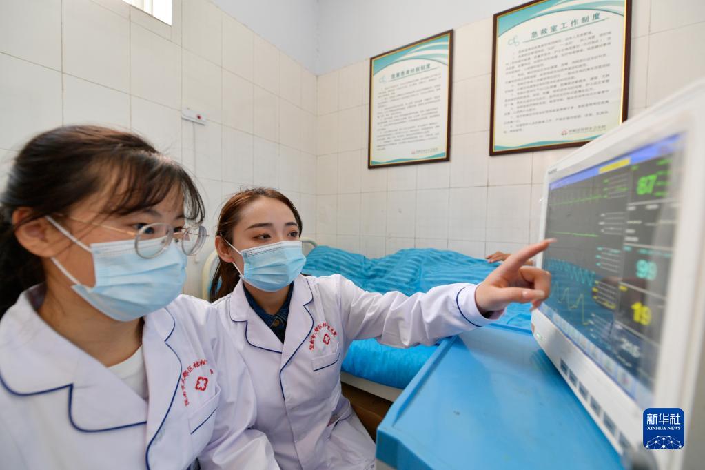 在武都区桔柑镇卫生院,李瑞(右)给同事讲解心电监护仪各项数值正常范围(5月11日摄)。新华社记者 范培珅 摄