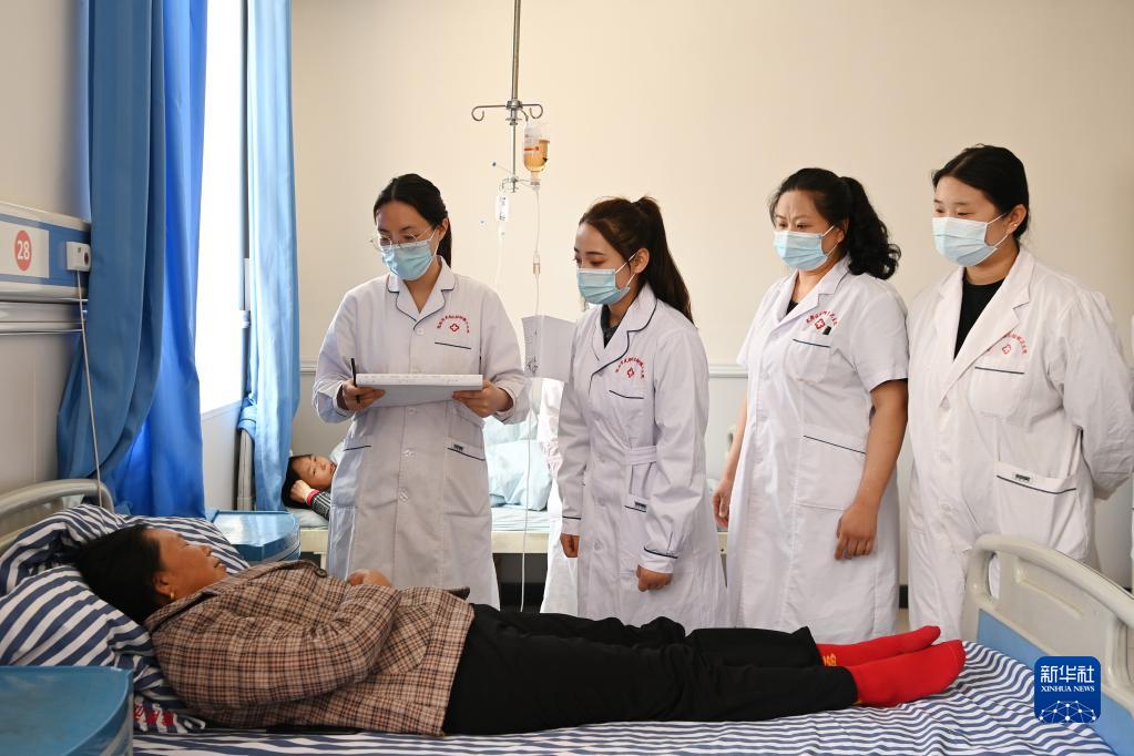 在武都区桔柑镇卫生院,李瑞(左二)和同事们一起例行查房(5月11日摄)。新华社记者 范培珅 摄