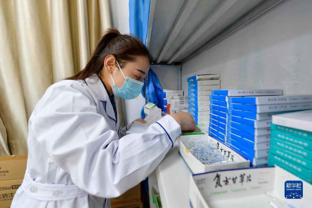 在武都区桔柑镇卫生院药房,李瑞为住院患者取药(5月11日摄)。新华社记者 范培珅 摄