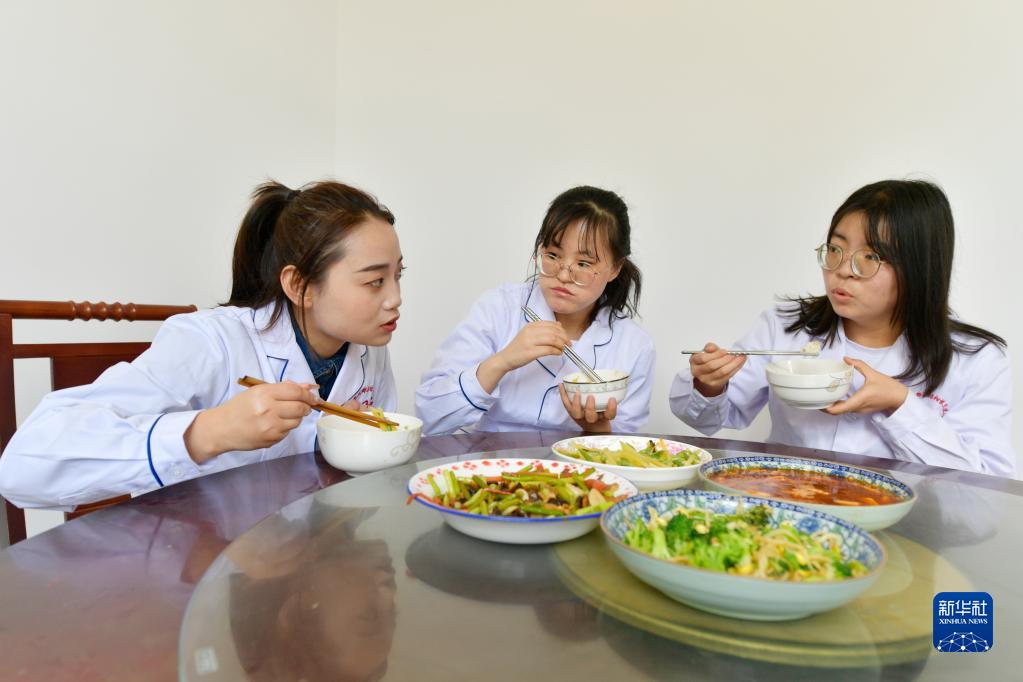 在武都区桔柑镇卫生院,李瑞(左一)午餐时间了解新入职同事生活情况(5月11日摄)。新华社记者 范培珅 摄