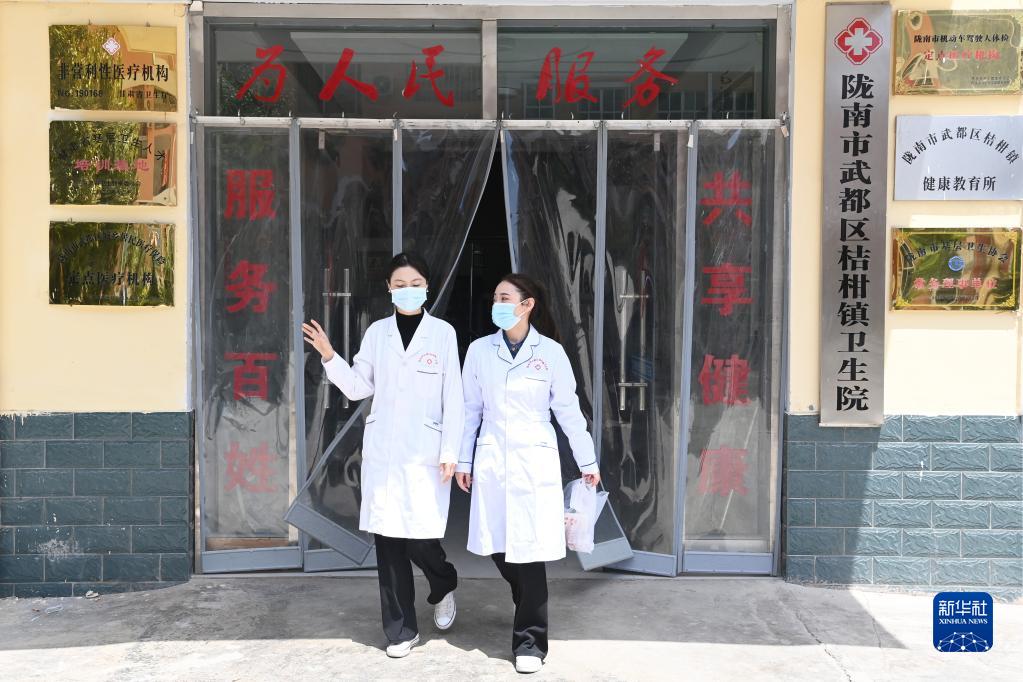 在武都区桔柑镇卫生院,李瑞(右)外出前往出院患者家中回访(5月11日摄)。新华社记者 范培珅 摄