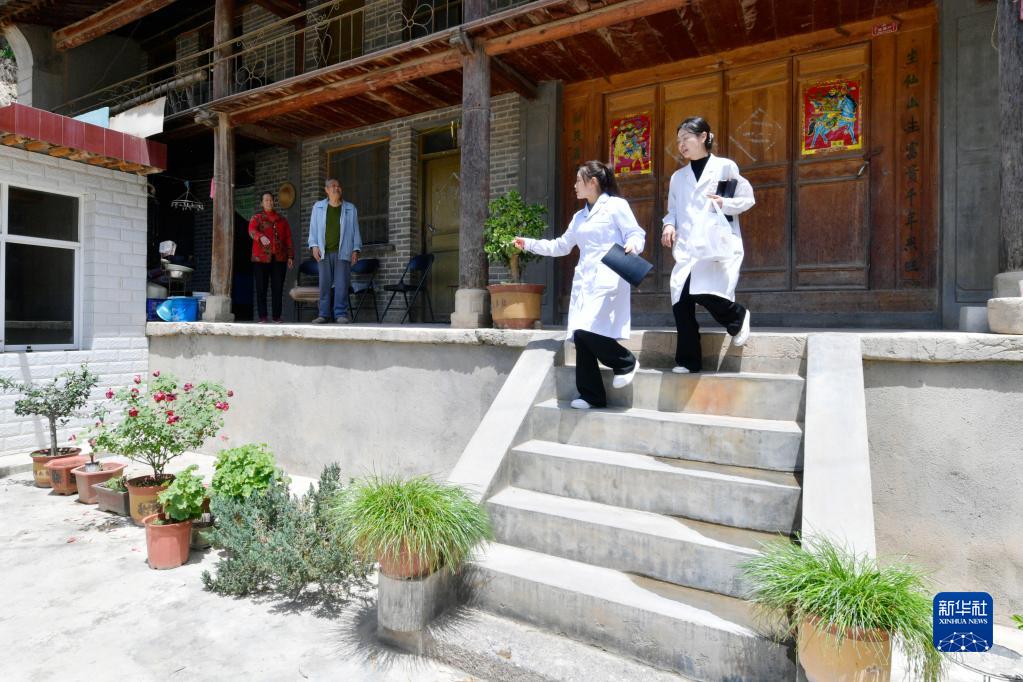 在武都区桔柑镇大岸庙村,李瑞(右)和同事前往出院患者家中回访(5月11日摄)。新华社记者 范培珅 摄