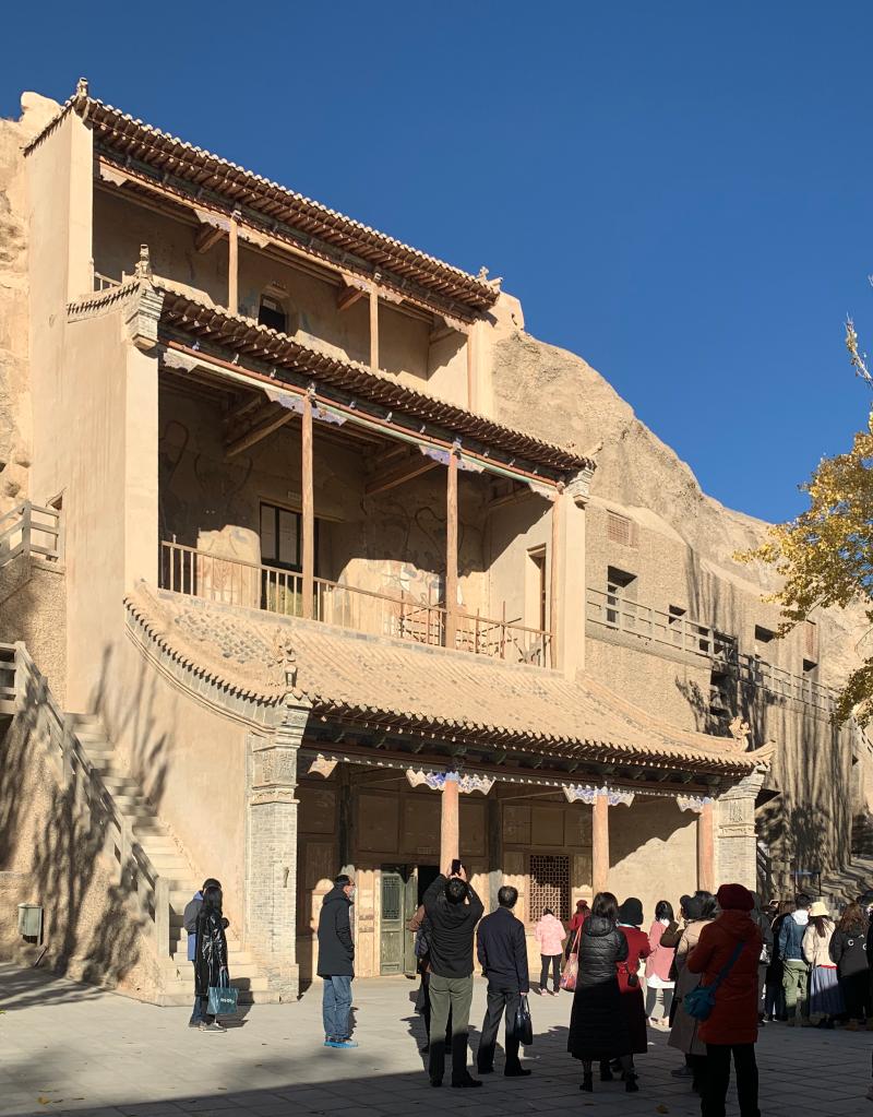 游客在藏经洞所在的莫高窟三层楼前驻足。新华社记者 张玉洁 摄