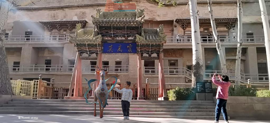 置身莫高窟,拿起手机,身披丝带的九色鹿竟从壁画中“飞身而下”。摸摸它,乖巧的小鹿还会轻扭身体,与人互动。人、实体洞窟和虚拟画面三者同时出现在镜头里,常令游客倍感新奇。