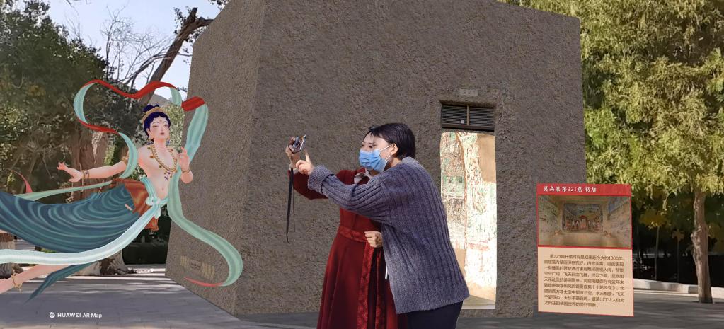 在虚实结合的“飞天”游览线路里,游客不仅能看到虚拟全景洞窟、不同朝代的飞天集锦,还能观看文物保护短片。通过构建莫高窟窟区厘米级3D地图、结合高精度空间计算技术,敦煌文物数字化成果得以在实景空间呈现。