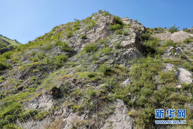 陇海铁路1435公里Ⅰ级防洪点被防护网防护的山崖。新华网发(童张伟 摄)