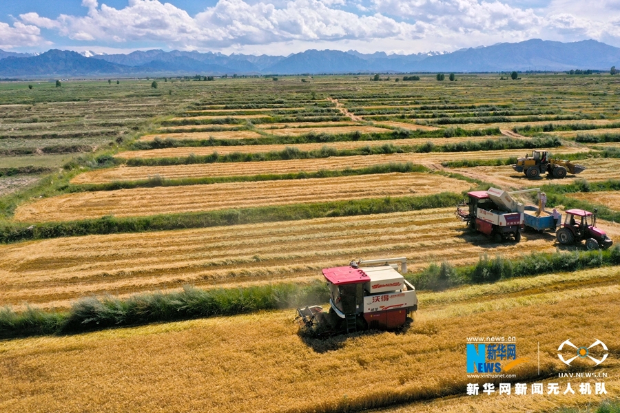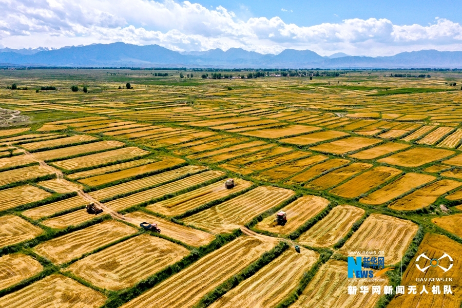盛夏时节,位于祁连山下的甘肃省张掖市,小麦陆续进入成熟期,田野间机器轰鸣,一派忙碌的麦收景象。(视频剪辑:宋燕 拍摄:成林)