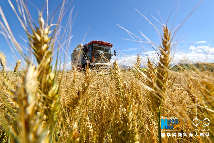 7月27日,甘肃省张掖市民乐县新天镇钱寨村小麦连片种植基地,联合收割机正在收割小麦。新华网发 (王将 摄)