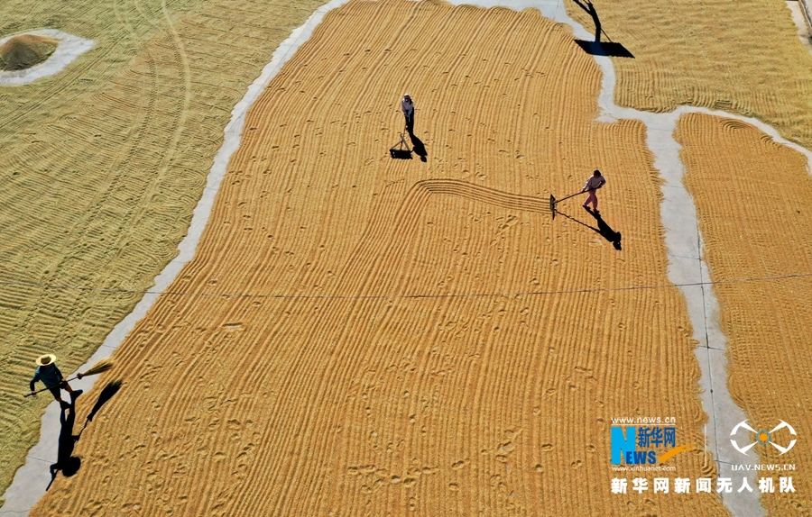 甘肃省张掖市民乐县新天镇钱寨村小麦晾晒场上,农户正在晾晒收获的小麦。新华网发 (王将 摄)