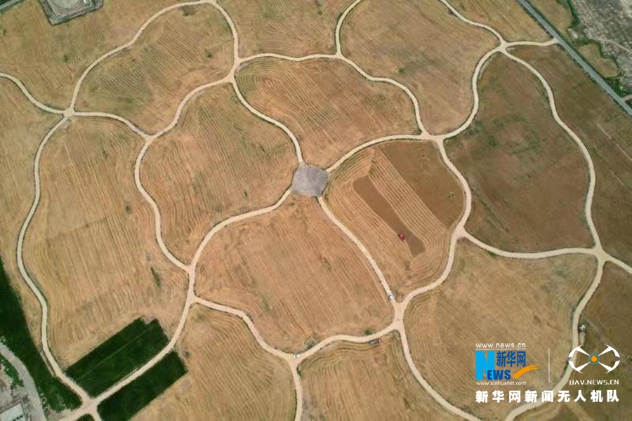 这是7月26日航拍的甘肃省张掖市民乐小麦收割场景。新华网发 (王晓泾 摄)