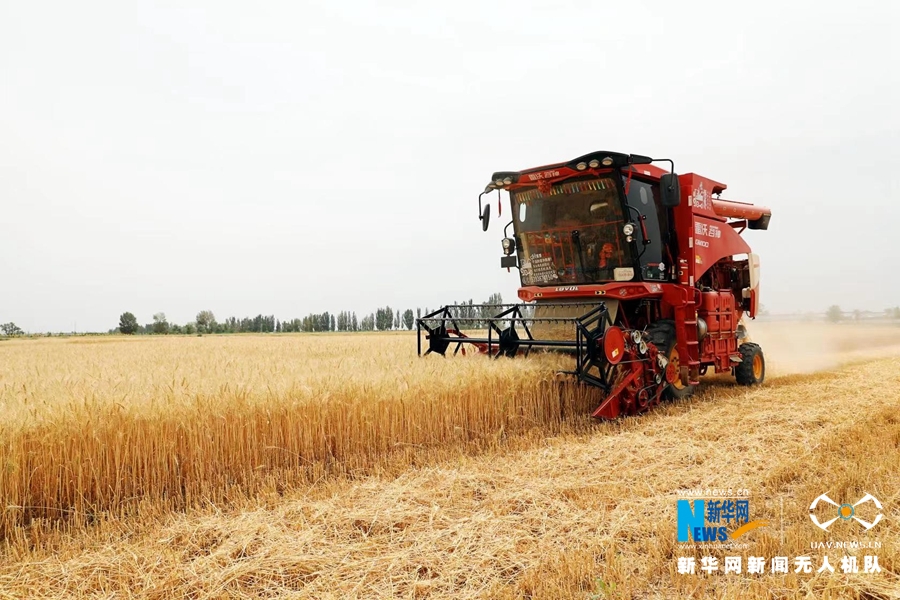 一台收割机正在收割小麦。新华网发 (王晓泾 摄)