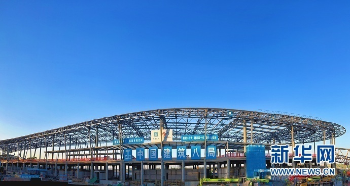 兰州中川国际机场三期扩建工程航站楼工程D指廊钢结构屋盖桁架封顶。(中建八局供图)