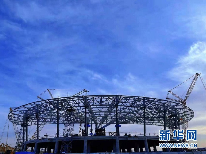 今年7月28日,项目团队克服疫情影响,主体结构提前33天全面封顶,目前项目已全面进入主楼钢屋盖提升以及金属屋面施工阶段。