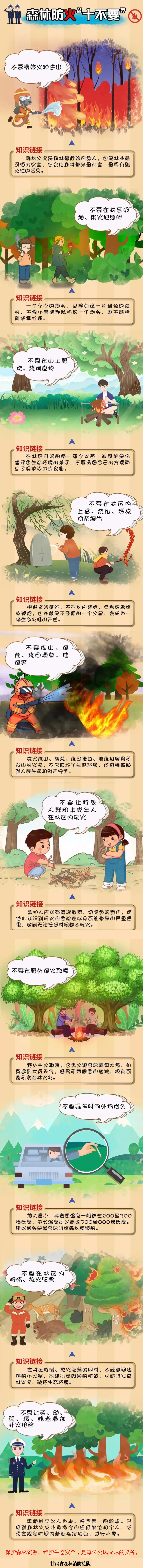 火灾是森林最危险的敌人,也是林业最可怕的灾害,会给森林带来毁灭性的后果。防范森林火灾人人有责,务必做到这十个“不要”。(编辑:宋燕 制作:梁皓清 杨文天 来源:甘肃省森林消防总队)