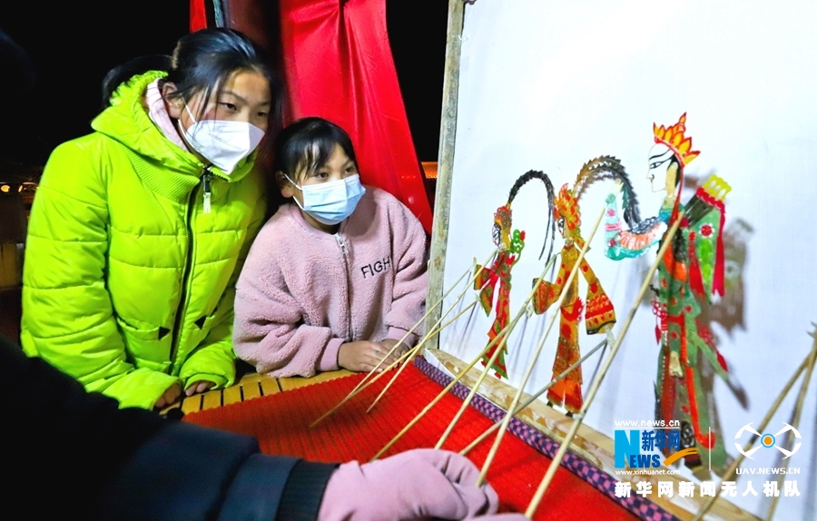 九曲黄河灯阵启灯仪式上,小朋友在观看非物质文化遗产皮影戏。新华网发(王将 摄)