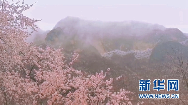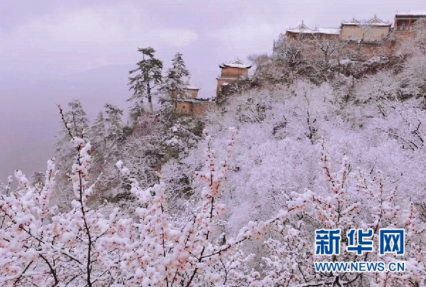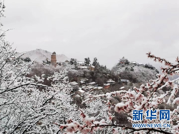 受冷空气影响,3日,甘肃省平凉市崆峒山景区迎来一场春雪。洁白的雪花与粉红的桃花浪漫邂逅,为春日崆峒山增添了色彩与生机。(祁秋谨 徐振华)