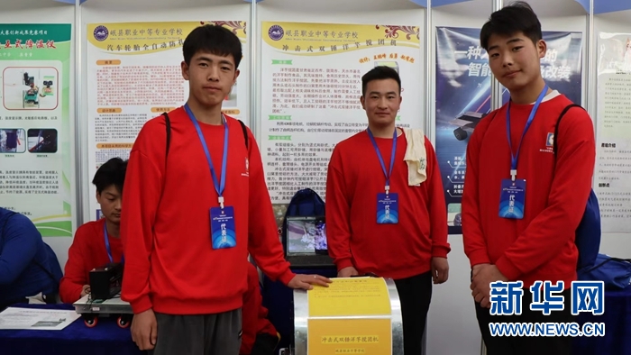 岷县职业中等专业学校学生展示创意作品“冲击式双锤洋芋搅团机”。