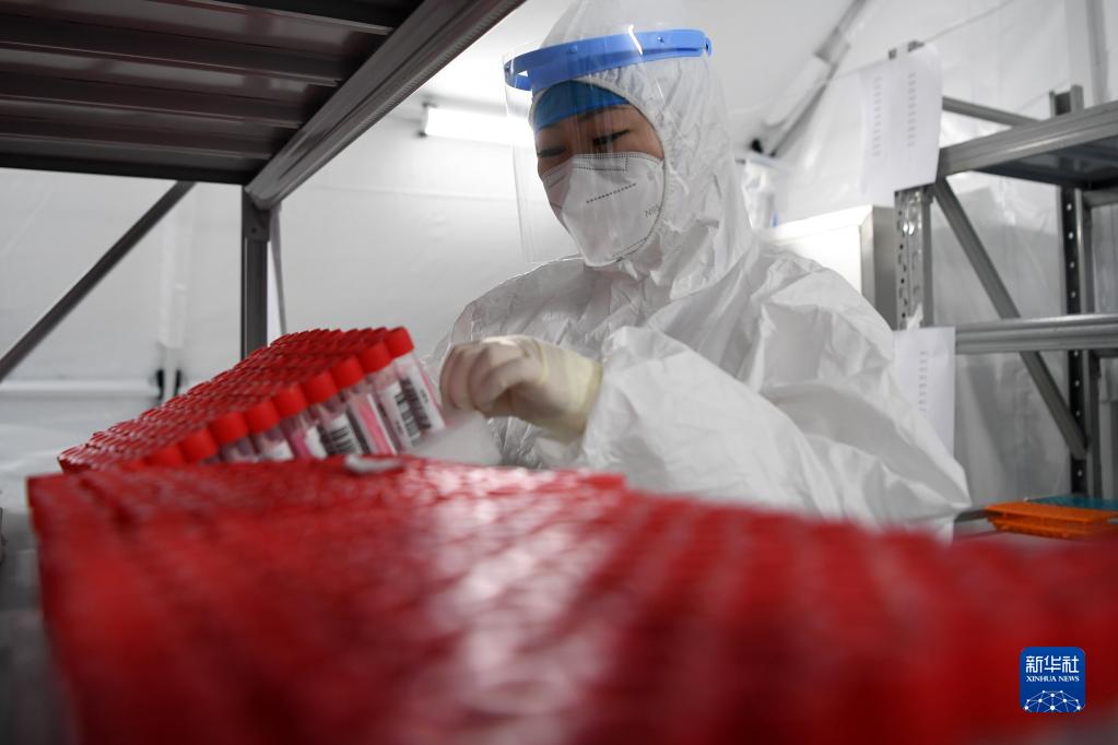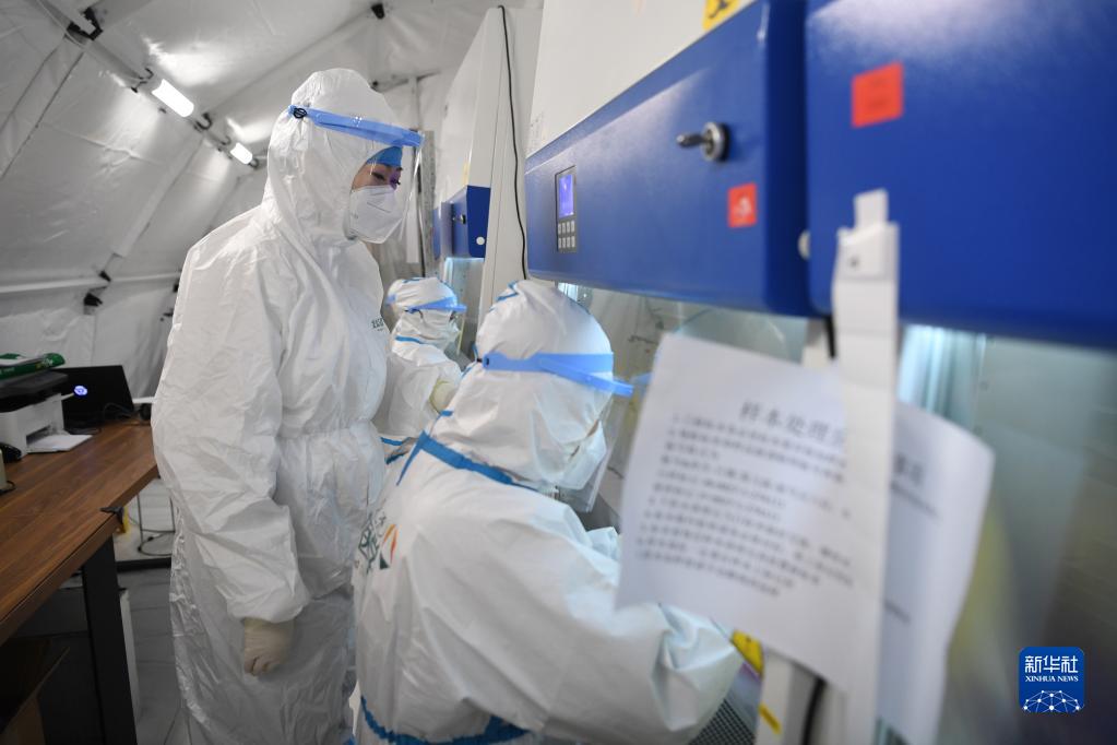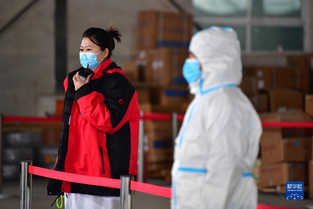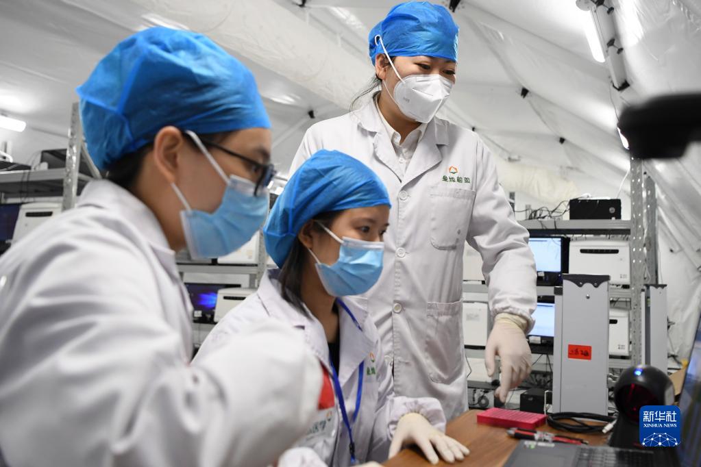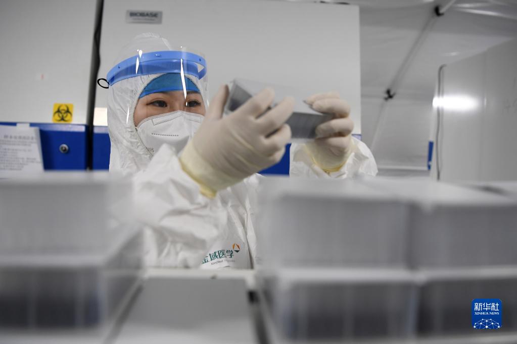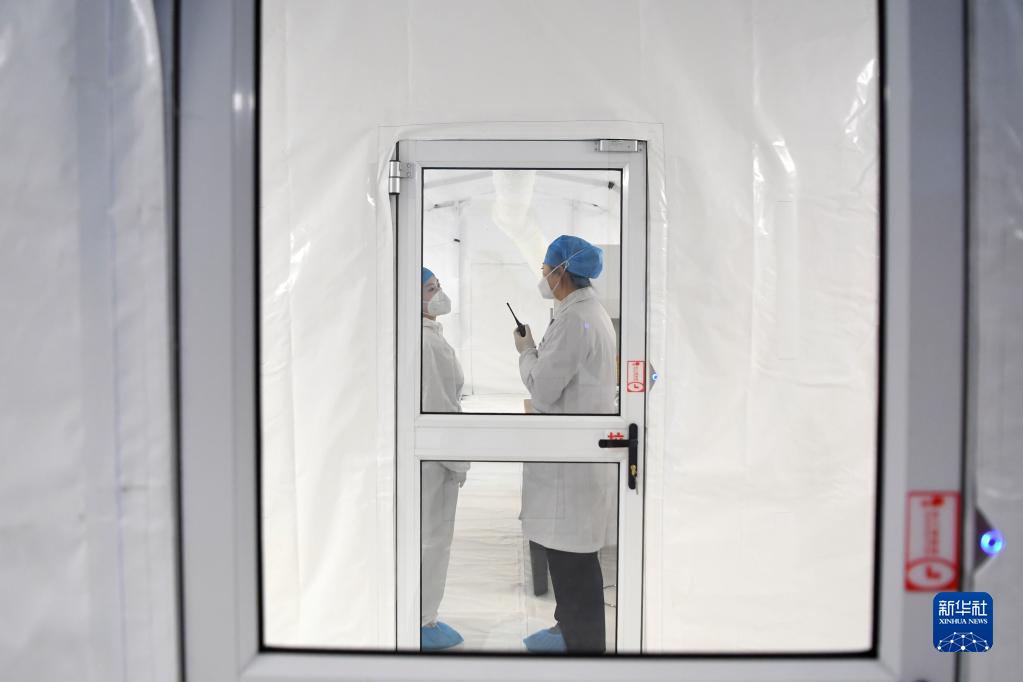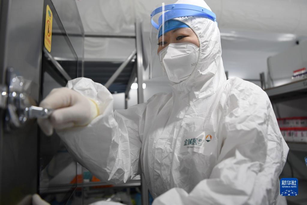 紧张忙碌的“猎鹰号”硬气膜实验室内,1996年出生的佟锦媚穿梭在气膜舱内,用对讲机不停地与工作人员沟通核酸检测进度和注意事项。