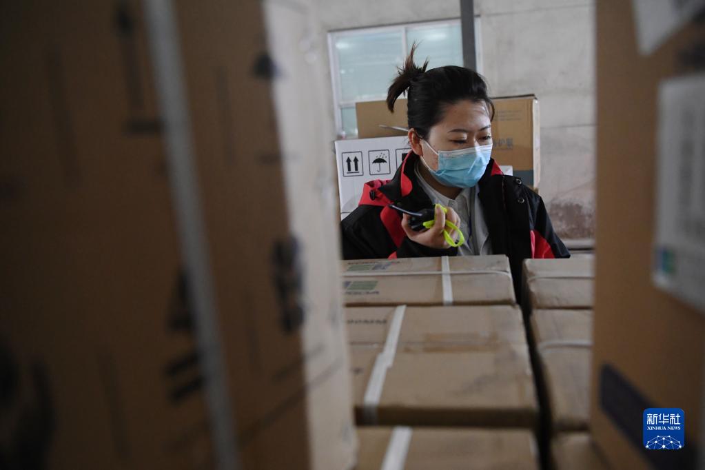 佟锦媚在“猎鹰号”硬气膜实验室外查看清点防疫物资(10月26日摄)。新华社记者 陈斌 摄