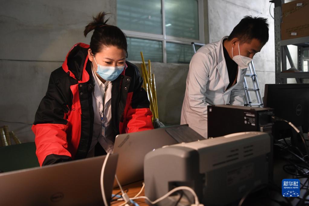 佟锦媚(左)和同事在“猎鹰号”硬气膜实验室外的耗材区用电脑查看防疫物资领取情况(10月26日摄)。新华社记者 陈斌 摄