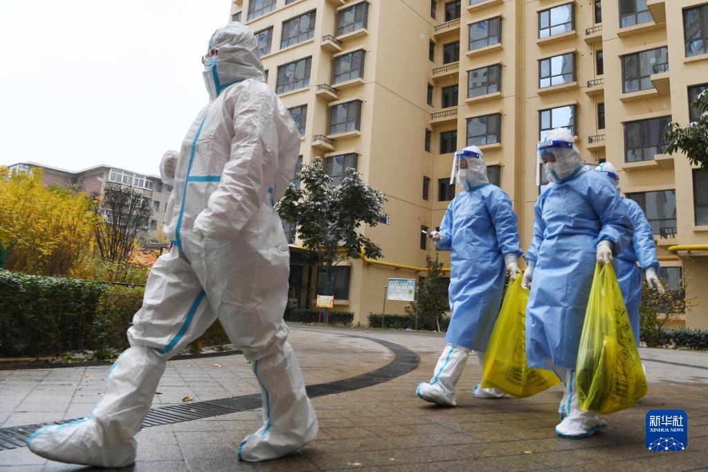 11月6日,在兰州市七里河区仁恒美林郡小区,社区工作人员和志愿者准备为居家群众配送物品。新华社记者 范培珅 摄