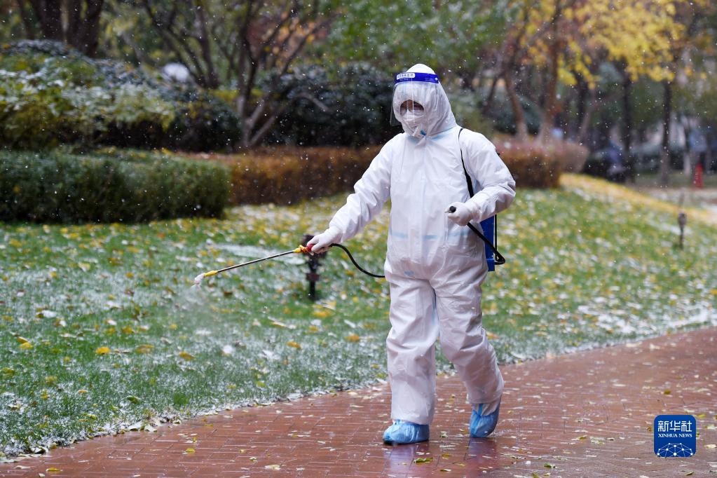 11月6日,在兰州市七里河区仁恒美林郡小区,工作人员在小区内部进行消杀作业。新华社记者 范培珅 摄