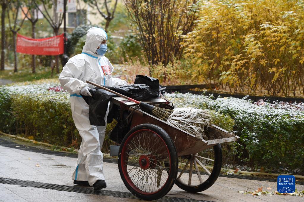 11月6日,在兰州市七里河区光明苑小区,工作人员打扫小区内卫生。新华社记者 范培珅 摄