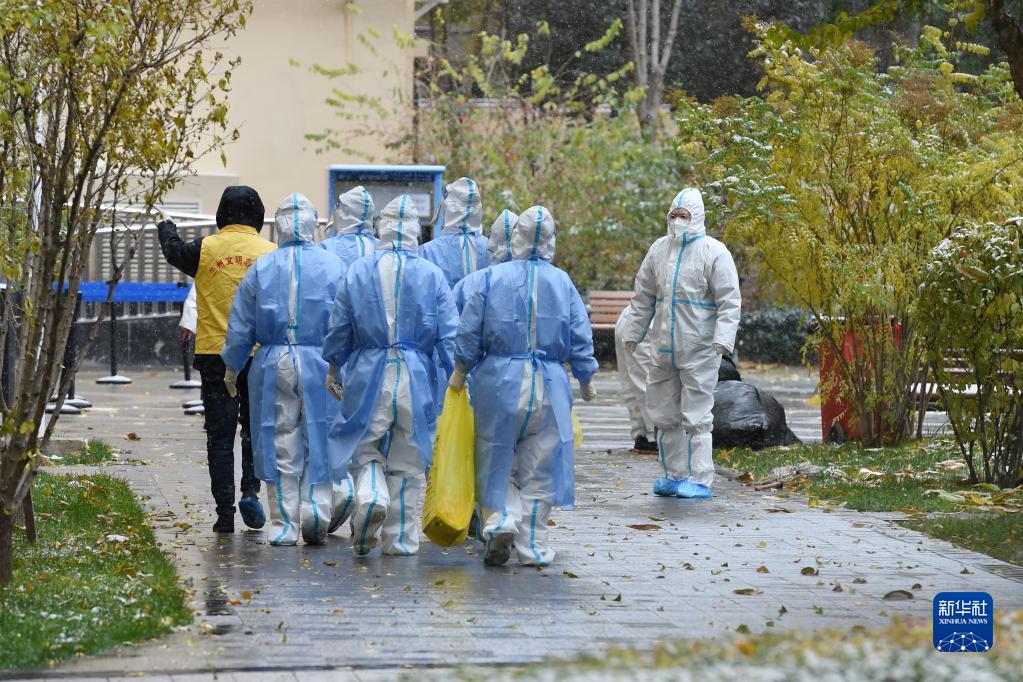 11月6日,在兰州市七里河区光明苑小区,医护人员准备入户开展核酸检测。新华社记者 范培珅 摄