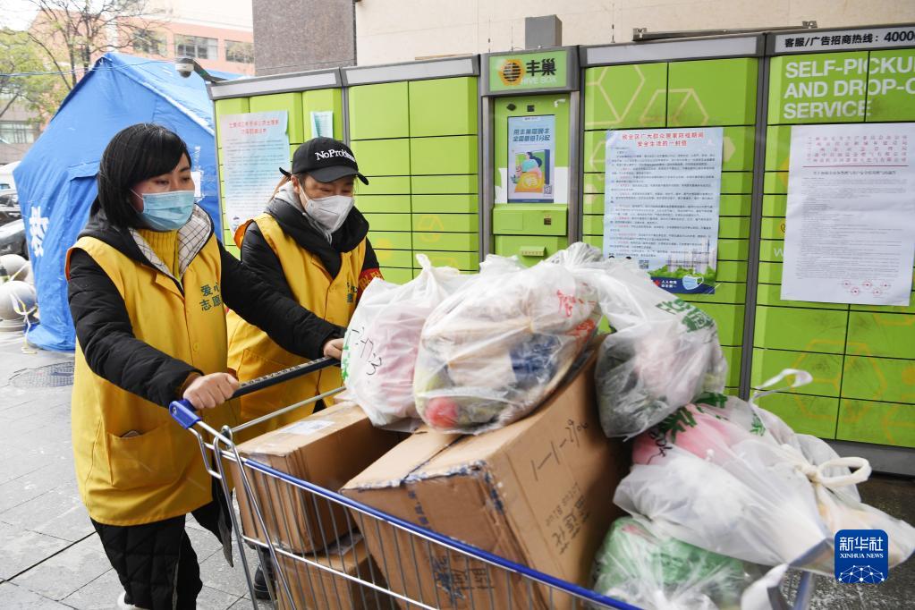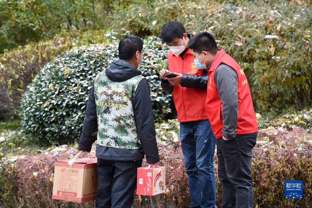 11月6日,在兰州市七里河区光明苑小区,志愿者为封控区内群众转运生活物资。新华社记者 范培珅 摄