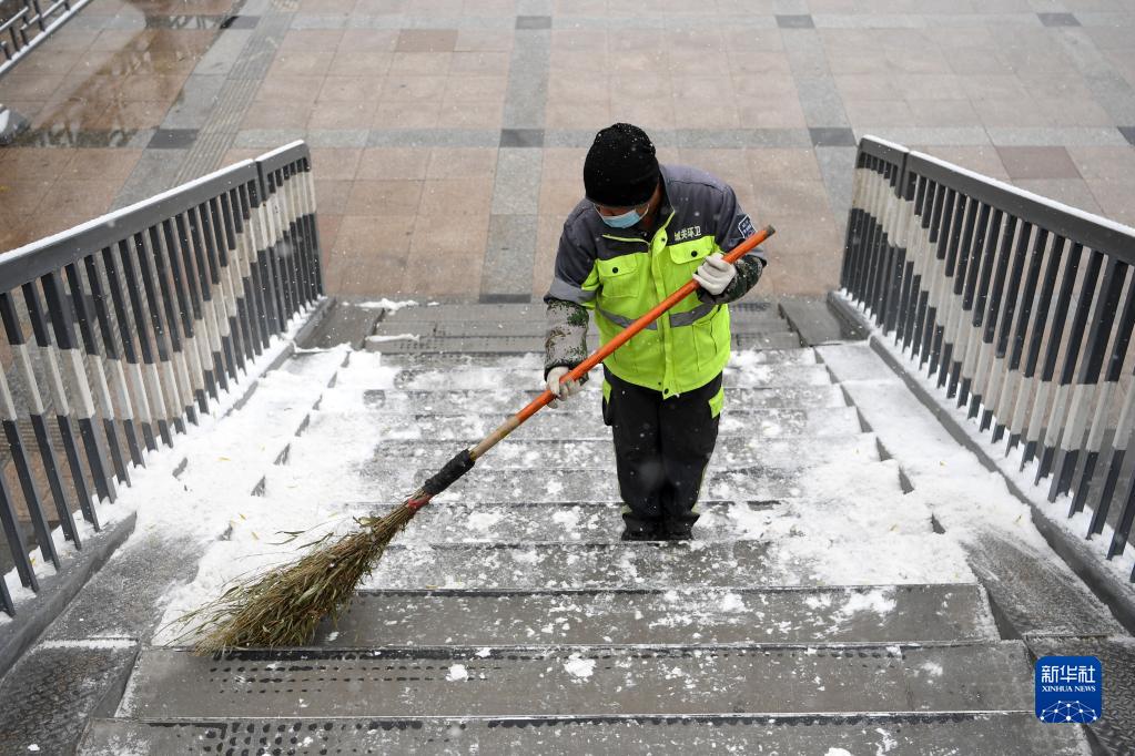 11月6日,在兰州市城关区南滨河路,环卫工人清扫过街天桥楼梯上的积雪。新华社记者 范培珅 摄