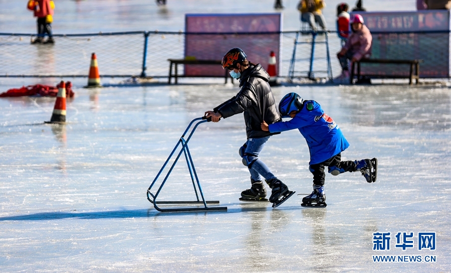 1月16日,甘肃省酒泉市肃州区锦玉公园滑冰场,市民正在滑冰。新华网发 (侯崇慧 摄)