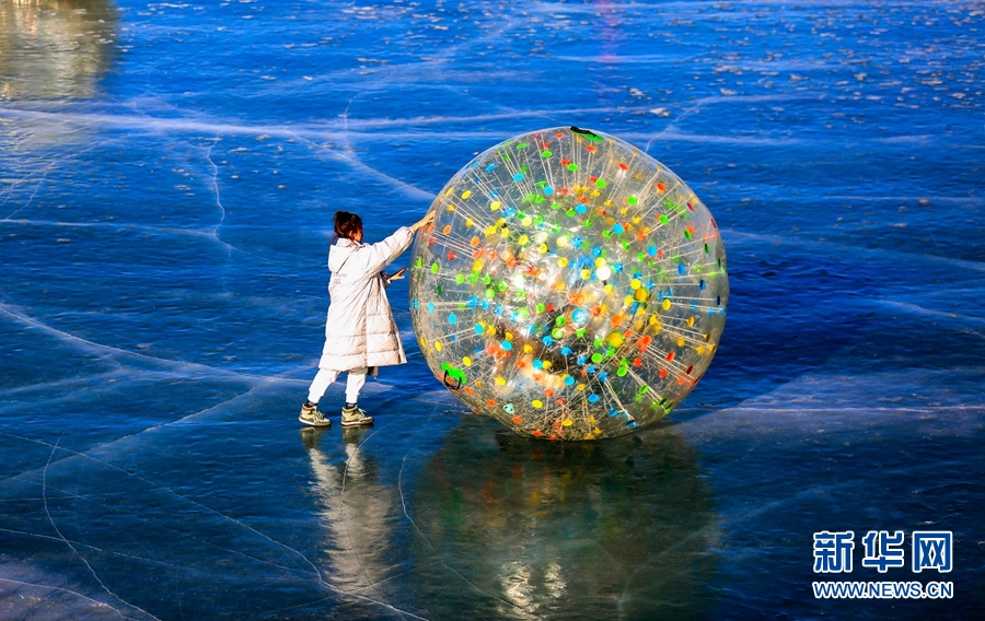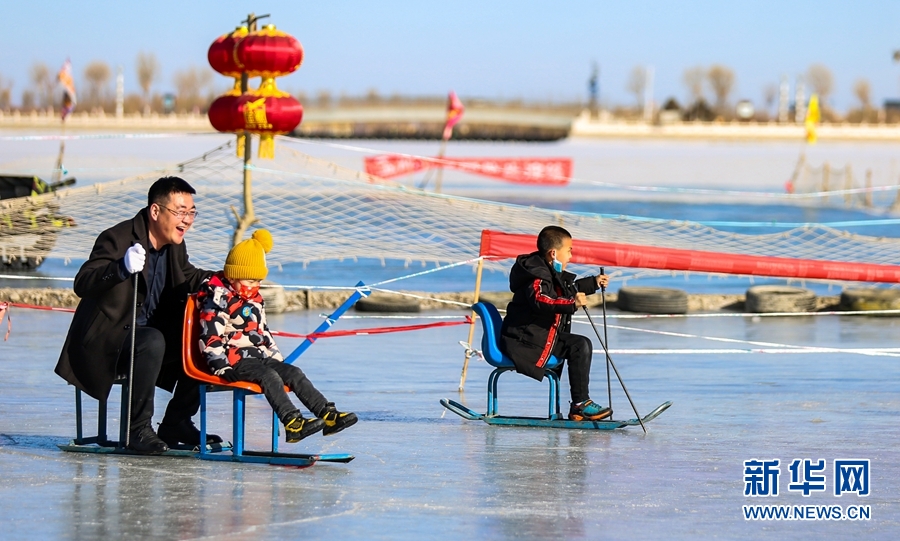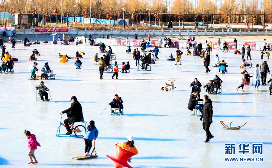 冬日,在甘肃省酒泉市肃州区锦玉公园的滑冰场里,极具趣味的冰上运动项目, 吸引着市民前来参与游玩。