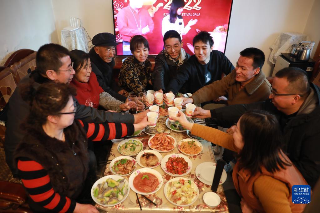 在兰州市七里河区西果园镇袁家湾村,村民张学文(右二)一家在家中同享年夜饭(1月31日摄)。 新华社记者 杜哲宇 摄