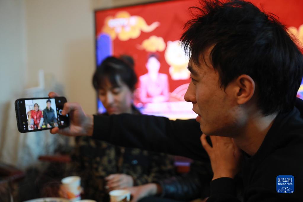 在兰州市七里河区西果园镇袁家湾村,村民张波(右)在家中给爷爷奶奶拍照(1月31日摄)。 新华社记者 张睿 摄