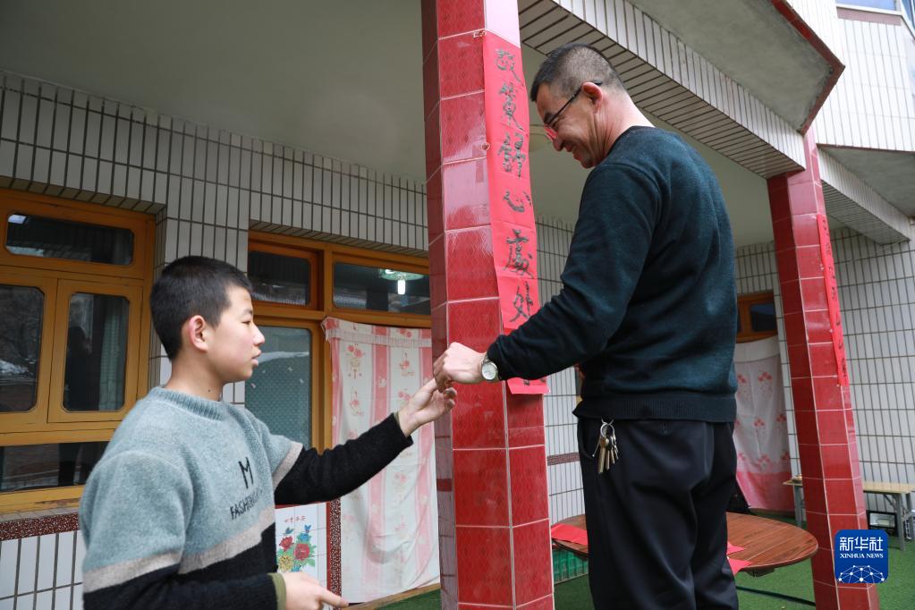 在兰州市七里河区西果园镇袁家湾村,村民马明祯(右)和儿子在家中一起贴春联(1月26日摄)。 新华社记者 杜哲宇 摄