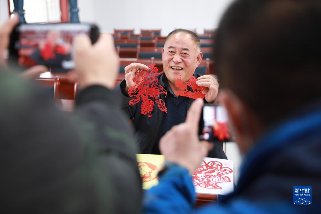 在兰州市七里河区西果园镇袁家湾村村民活动中心,村民袁正春展示自己剪的窗花(1月26日摄)。 新华社记者 杜哲宇 摄