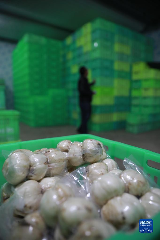 在兰州市七里河区西果园镇袁家湾村百合加工车间,村民许海燕将分拣完成的百合进行包装(1月26日摄)。 新华社记者 杜哲宇 摄