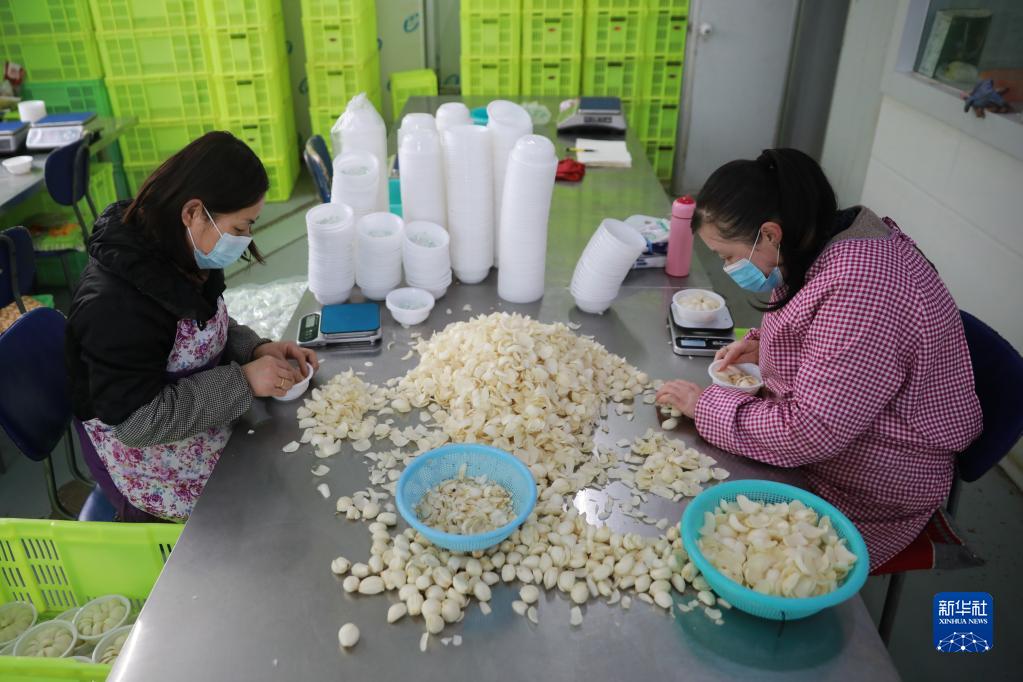 在兰州市七里河区西果园镇袁家湾村百合加工车间,村民孙晓英(右)和许海燕在分拣百合(1月26日摄)。 新华社记者 杜哲宇 摄