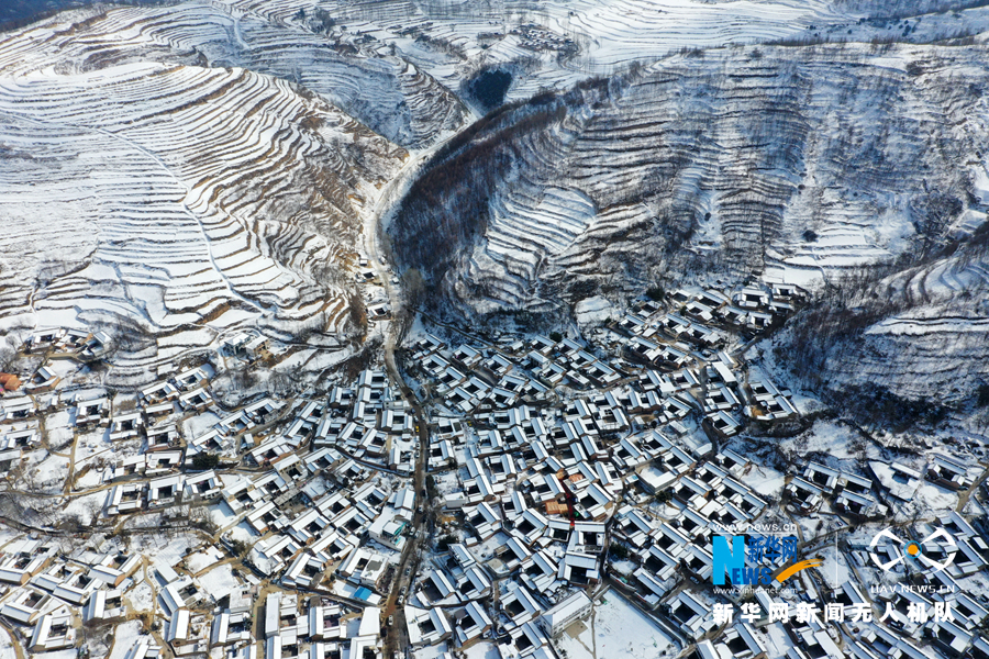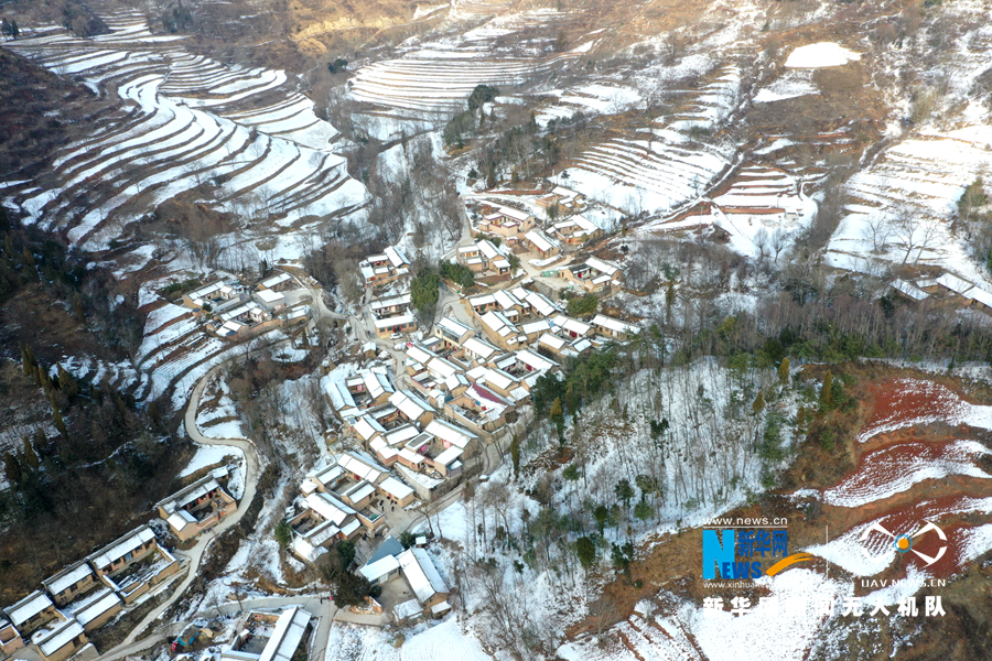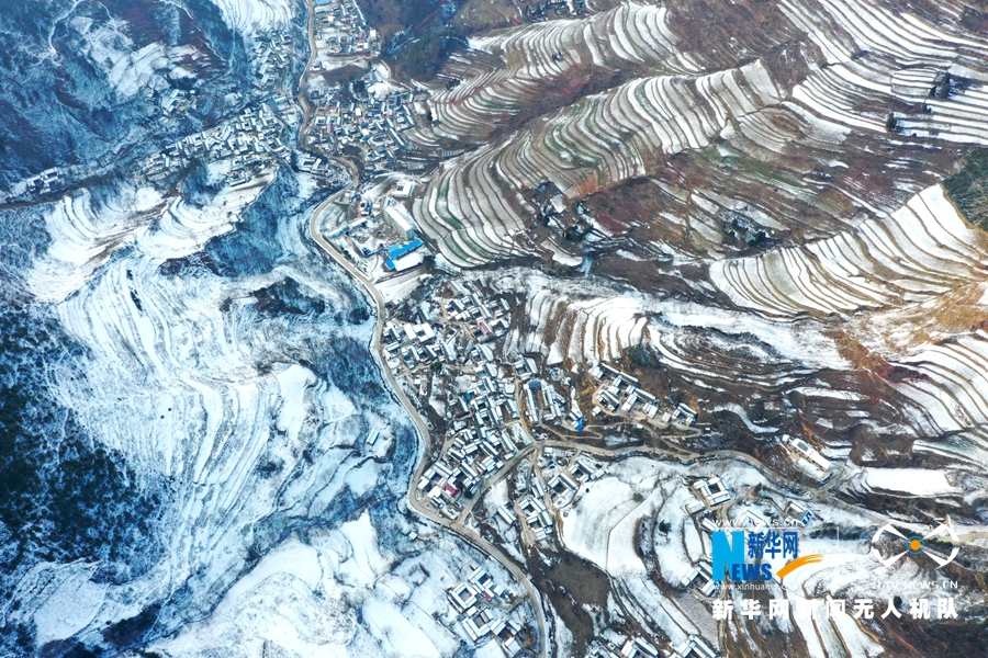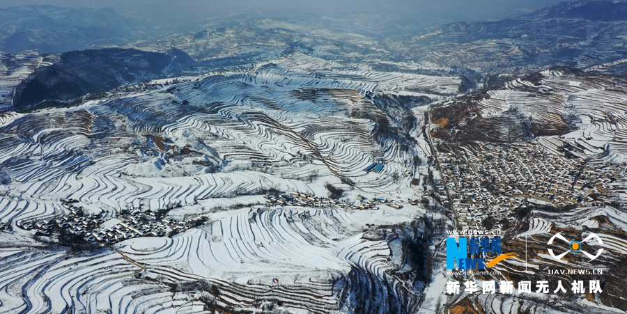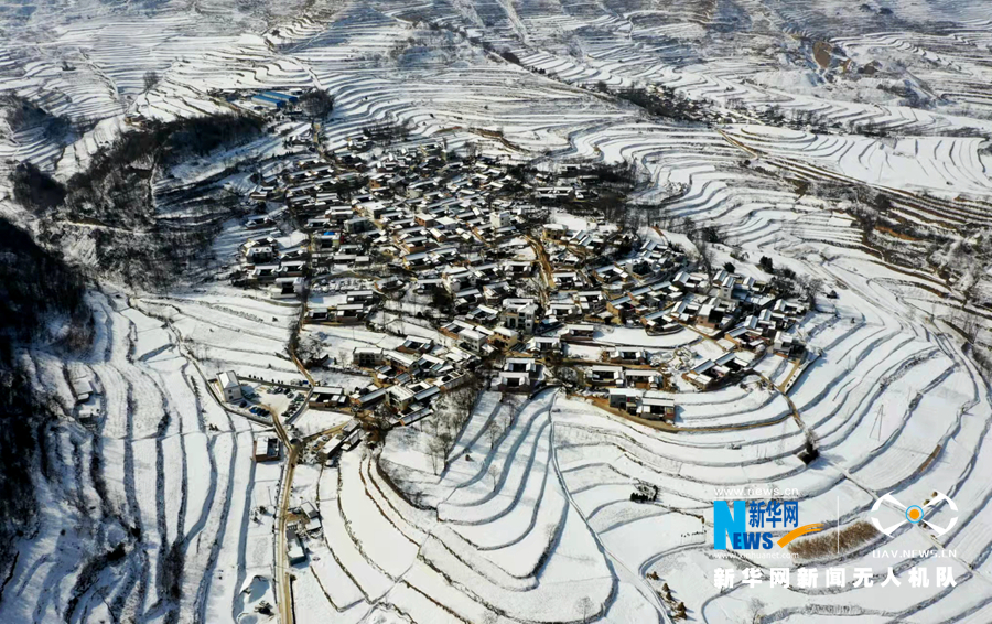 近日,一场大雪过后,甘肃省陇南市西和县马元镇的层层梯田高低错落、线条蜿蜒、精致美丽,村落镶嵌其中构成了一幅水墨田园画卷。新华网发(张平良 摄)
