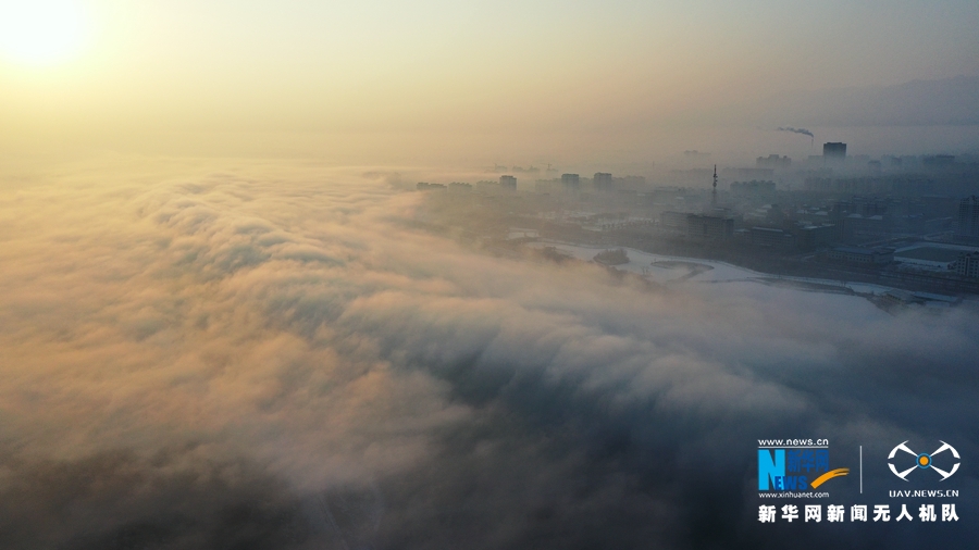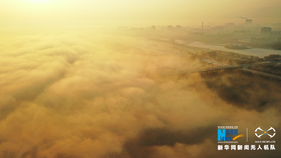 2月8日清晨,地处河西走廊黑河中游下段的甘肃省张掖市高台县黑河国家城市湿地公园上空水汽缭绕,“雾浪”翻滚。初升的朝阳,为之镀上了一层金色,恍如仙境。(拍摄:蔺鹏 剪辑:宋燕)