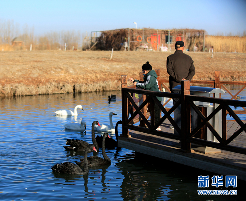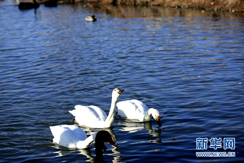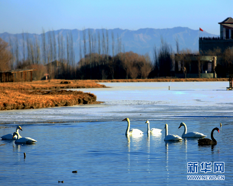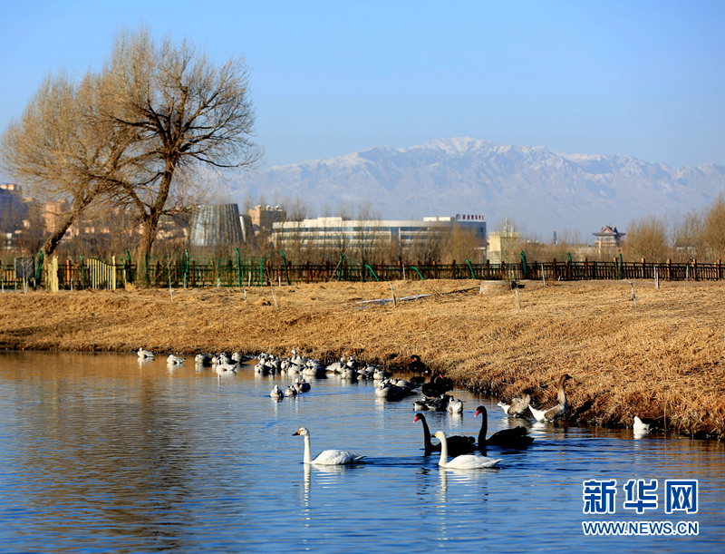 初春时节,甘肃省张掖国家湿地公园内的天鹅湖冰消雪融,一群天鹅在湖水中栖息觅食、嬉戏追逐,成为春日里的美丽景观。新华网发(陈礼 摄)