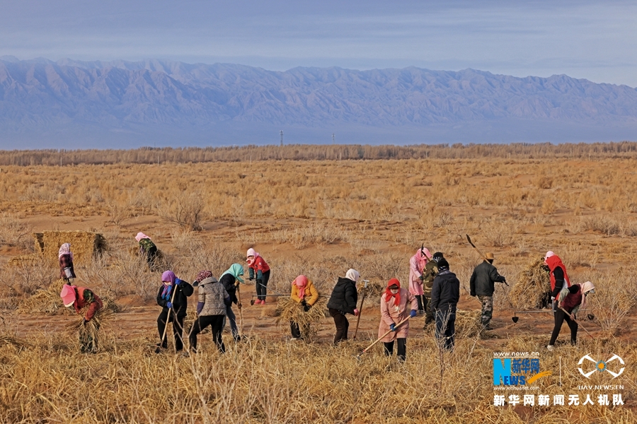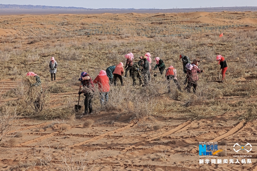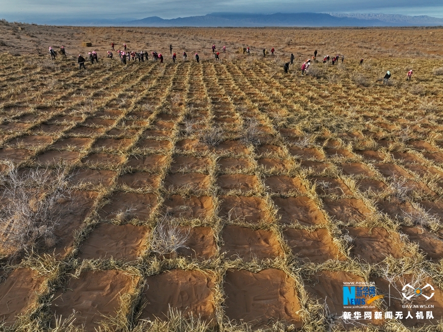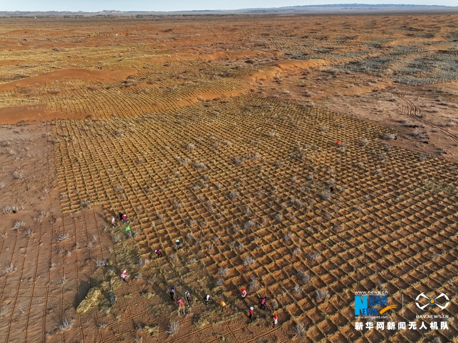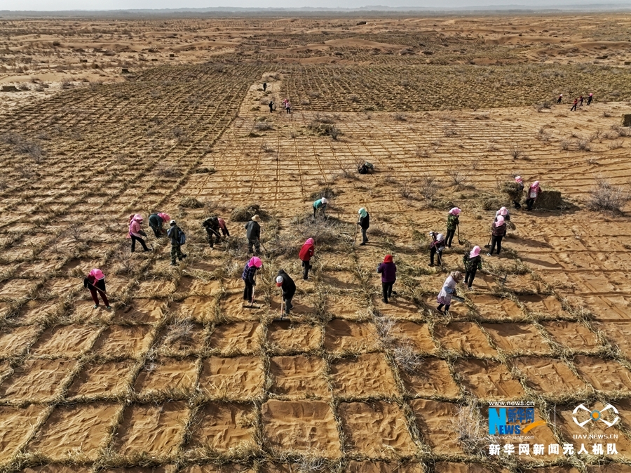 3月21日,甘肃省张掖市临泽县平川镇北部荒漠区防沙治沙工程现场,治沙人员分工负责,密切配合,打草方格、种植梭梭苗,荒漠戈壁上呈现出一派热火朝天的劳动场景。通过近年来的努力,临泽县已治理荒漠化土地8.7万亩,封育荒漠植被47.52万亩,初步形成了东西宽3至5公里、南北长17.5公里的北部绿洲生态屏障。