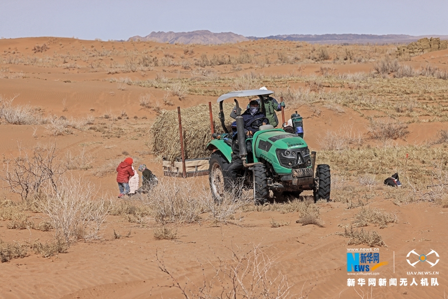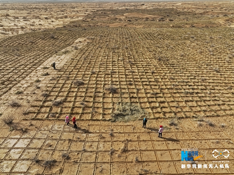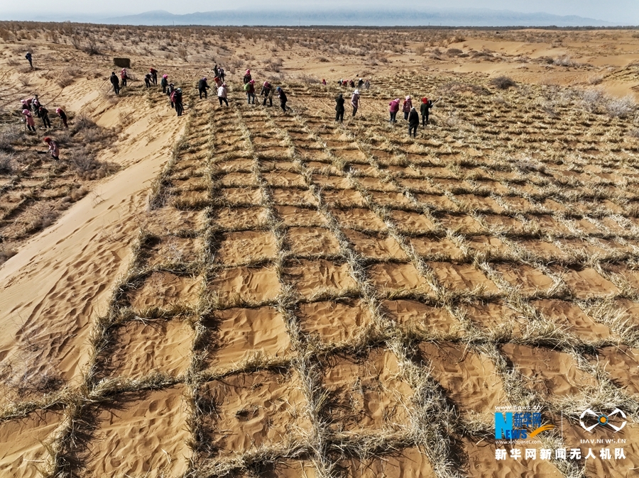 这是3月21日无人机拍摄的甘肃省张掖市临泽县治沙场景。新华网发 (王建平 摄)