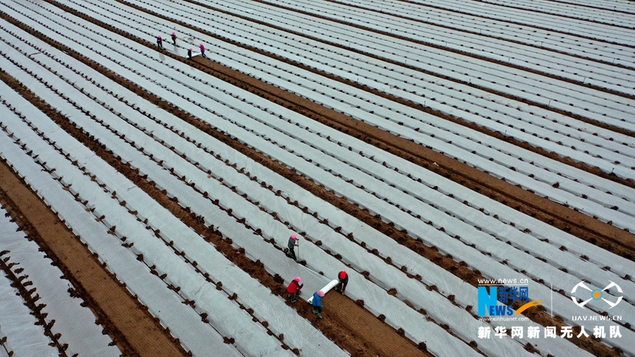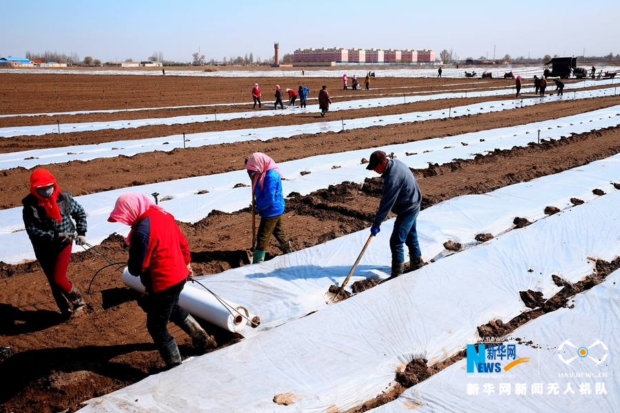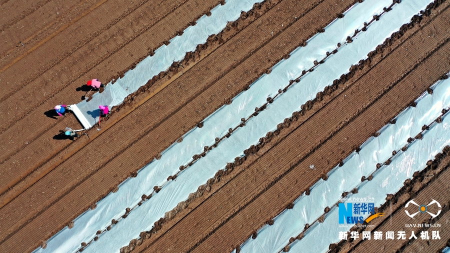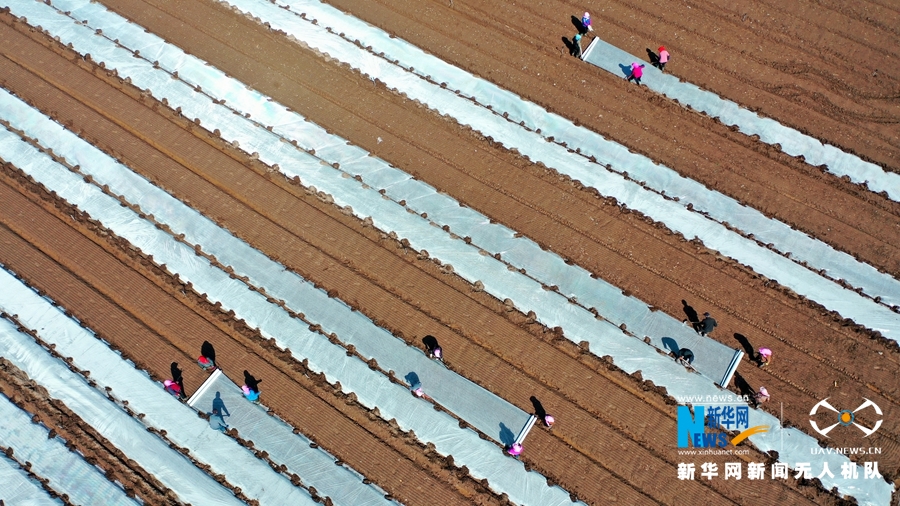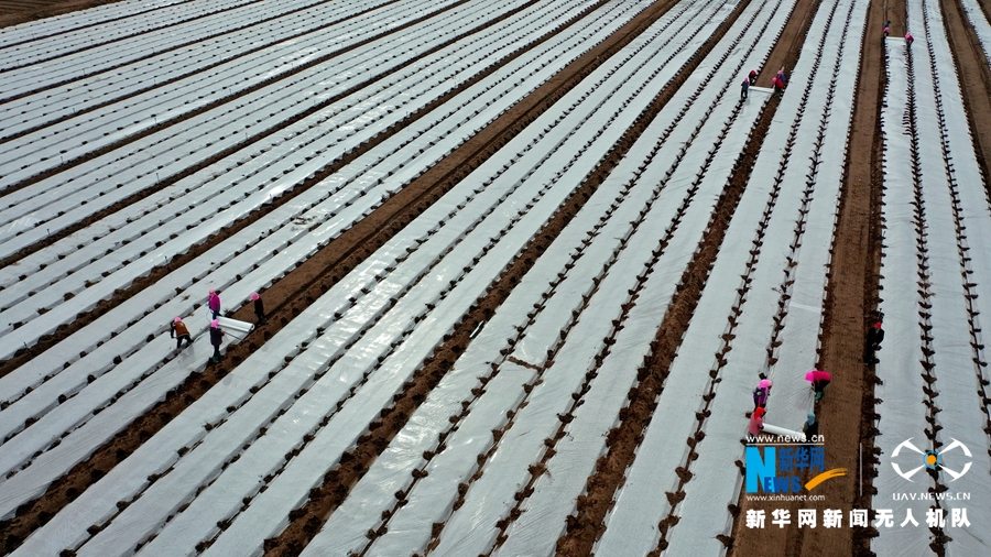 春耕时节,在位于河西走廊的甘肃省张掖市甘州区蔬菜基地,菜农抢抓晴好天气,覆膜种植菜芯,从高空俯瞰犹如一条条的白色“跑道”。