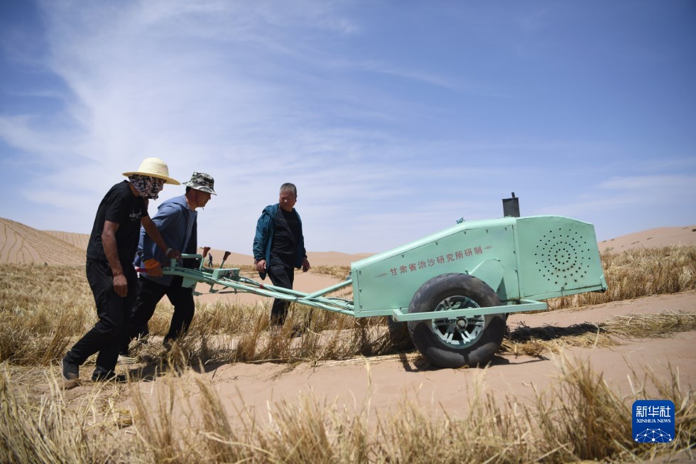 甘肃省武威市地处河西走廊东端,北接腾格里沙漠,部分地区曾长期遭受沙害困扰。为加快生态环境恢复和探索固沙治沙新路径,今年以来,甘肃省治沙研究所加大科技治沙力度,将历时四年研发的手扶式沙障机进行改良后大规模用于当地的治沙实践中,以提升固沙治沙的效率和水平。