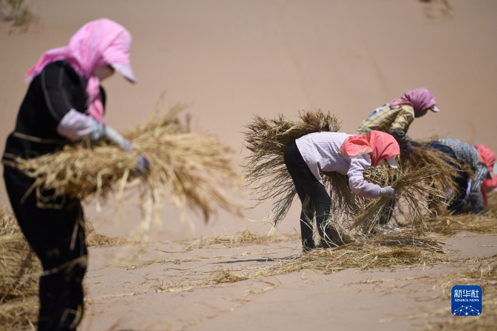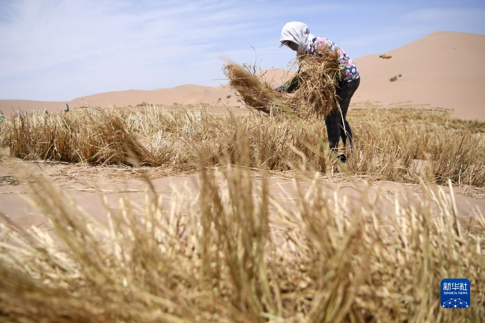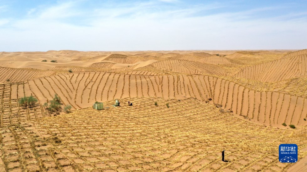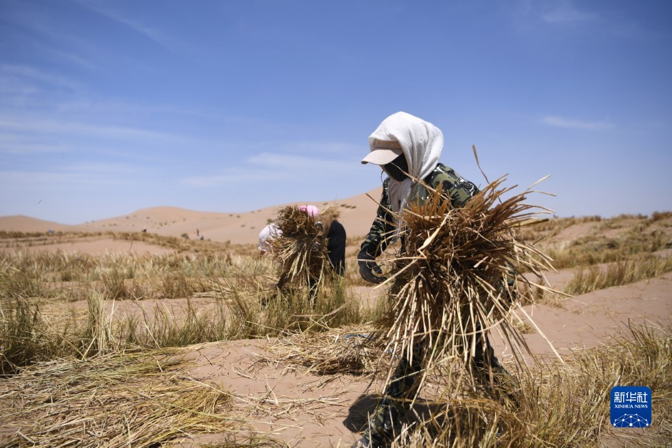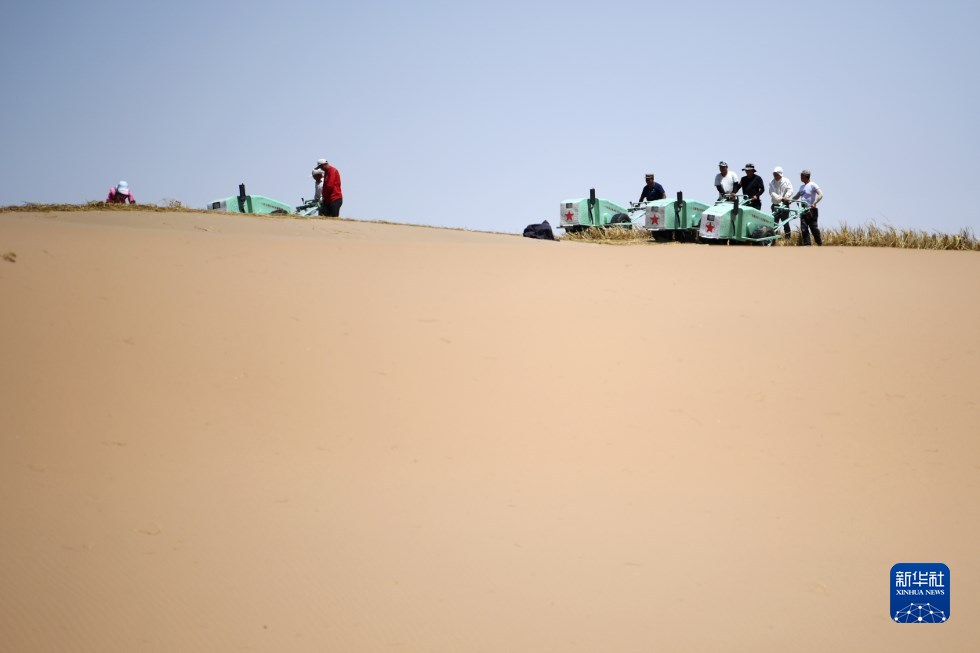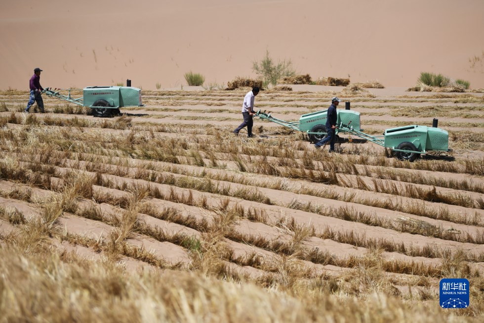 治沙工人在武威市凉州区邓马营湖治沙区域进行压沙作业(6月16日摄)。新华社记者 陈斌 摄