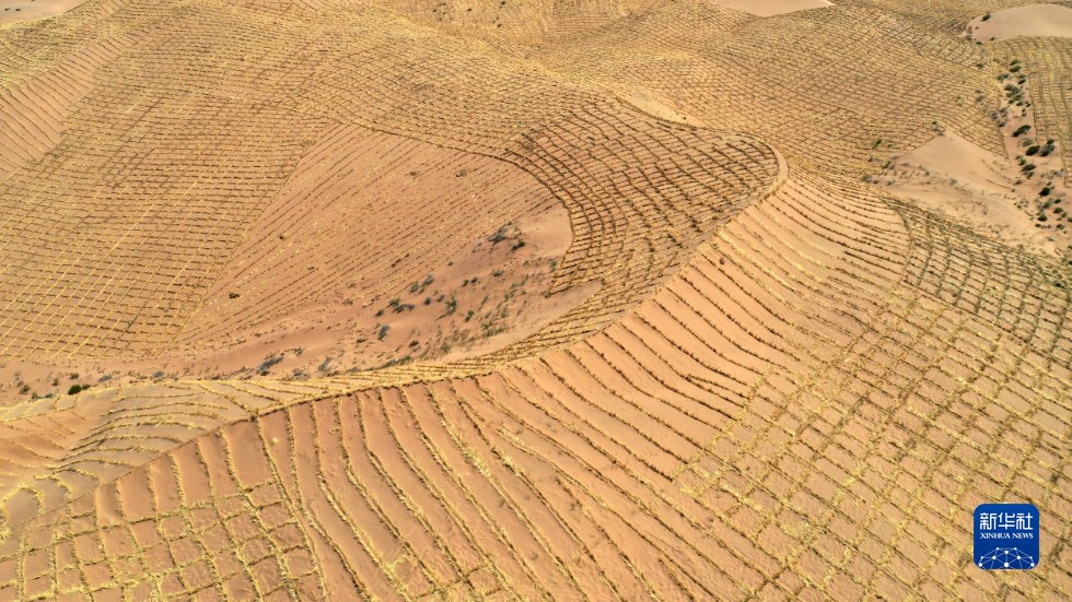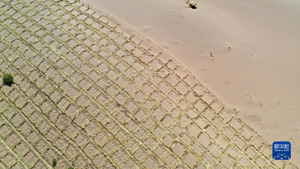 这是武威市凉州区邓马营湖治沙区域部分铺设完草方格沙障的沙漠(6月16日摄,无人机照片)。新华社记者 陈斌 摄