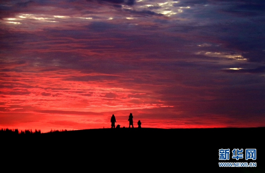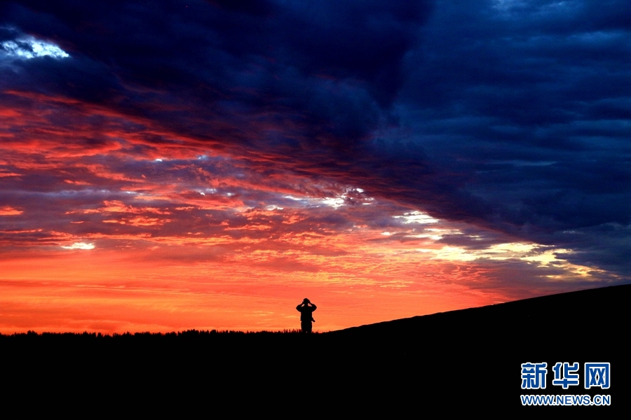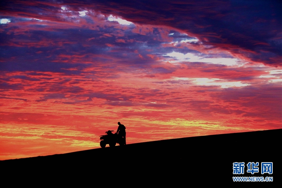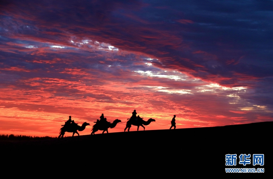 8月7日清晨,雨后的甘肃省敦煌市鸣沙山月牙泉景区朝霞满天,风光迷人。游客沐浴霞光,欣赏大漠如画景色。新华网发 (张晓亮 摄)