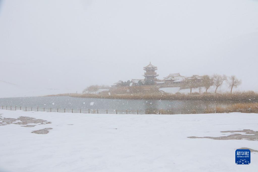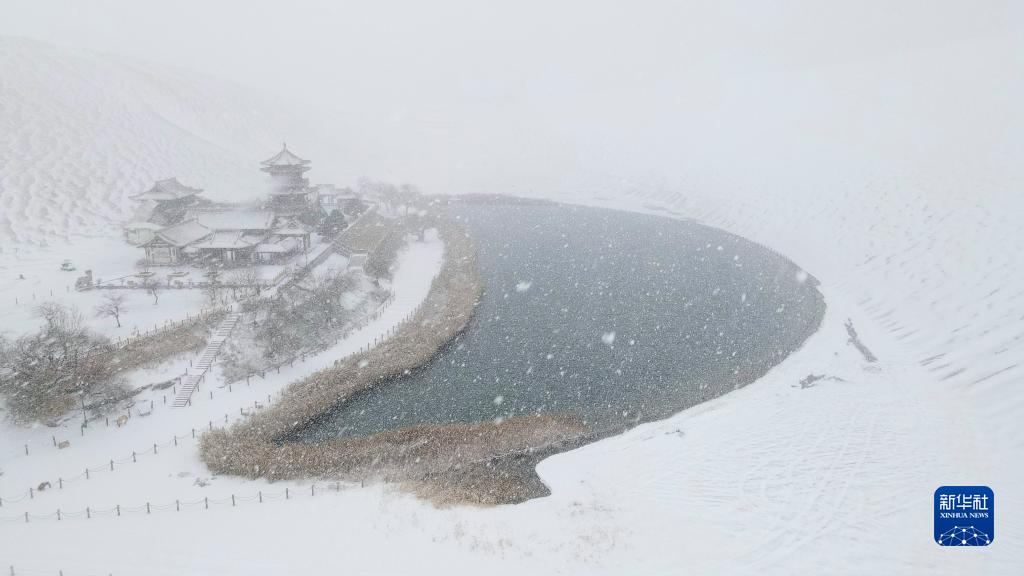 当日,甘肃敦煌迎来降雪。当地著名景点鸣沙山月牙泉银装素裹、分外迷人。